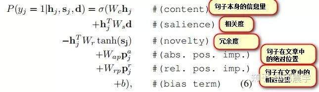 可以看到,它从多个不同维度去建模一个摘要句的特征,包括之前说的相关度和冗余度,除此之外还有句子本身包含的信息量,句子在文章中的位置(通常来说文章开头的句子是摘要句的可能性比较大)等。