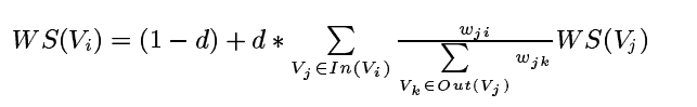 其中,  表示节点i和j之间的边权重,即两个句子之间的相似度。默认任意两个句子都是相连的。假设当前i=1,j=2,等式右侧第二部分中,分母表示句子2与所有句子的相似度的和,分子表示句子1与句子2的相似度,再乘上句子2的权重,得到句子2的一个分数。最后对于所有与句子1相连的句子j求和,得到所有的分数之和。