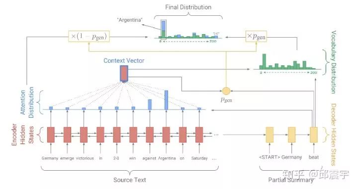 同时在模型中设计一个  ,表示最终使用的模型输出是否使用decoder生成的词的概率。如上图所示,encoder的attention生成的alignment会参与到最后decoder输出词分布的计算中。