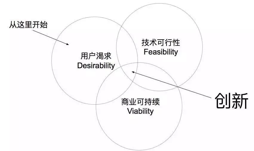 IDEO 这张很经典的图把「创新」定义为用户渴求、技术可行性和商业可持续的交集。一个成功的创新应该三者兼顾。