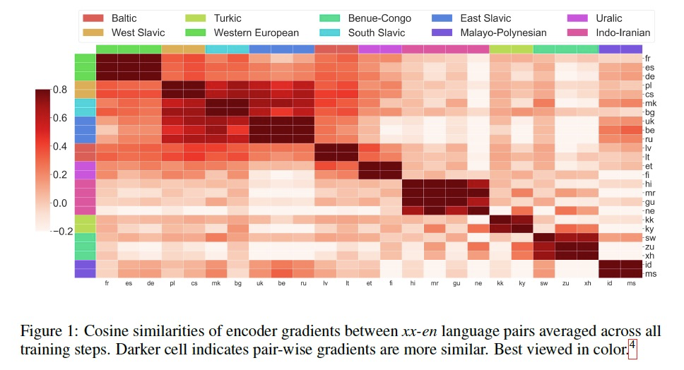 任务是翻译任务,不同的翻译语料共享一个大模型。如上图热力图,每一个格子的得分含义是:Baltic翻译成en的任务对应的gradient,与 Turkic翻译成en任务对应的gradient 之间的cosine similarity