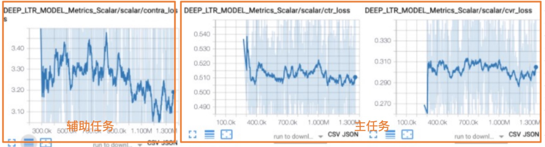 (3)优化策略方面,留意多个Loss的量级,如果差异很大,注意约束和控制;上图contra loss 与 ctr cvr的loss,差了一个量级。