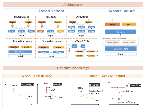 多任务多目标出现跷跷板、负迁移现象,微观的梯度冲突是本质。不论是从Architecture 还是 Optimization strategy两个维度来优化升级,殊途同归,都是要缓解冲突,减少多任务间的内耗。