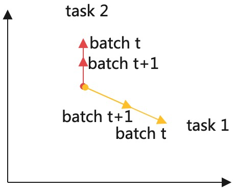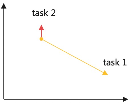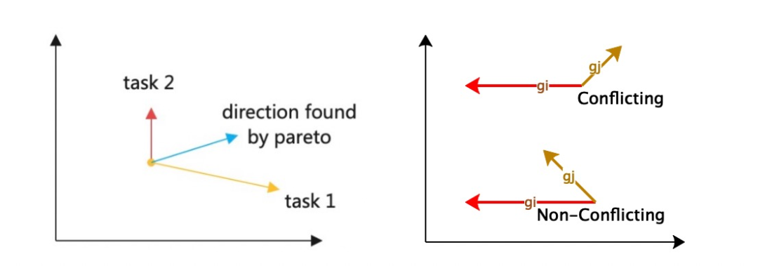 首先通过cosine相似度来定义两个任务在共享参数上是否是冲突的,如下图,conflicting是夹角大于90度,non-conflicting是小于90度。