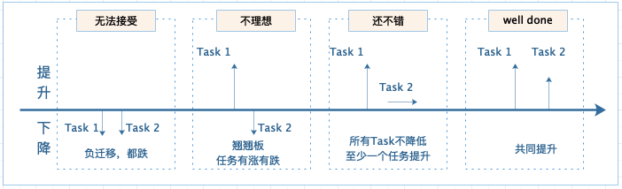 多目标共同学习的结果,有4种状态,如下示意图。“well done”: 最好的状态,所有share任务实现共同提升。“还不错”:其次的状态,所有任务不降低,至少一个任务提升。如果是主任务 + 辅助任务的搭配,能够实现牺牲辅助任务达到主任务提升的效果,也是well done。“不理想”:跷跷板现象,任务有涨有跌。“无法接受”:负迁移现象,所有任务都不如从前。