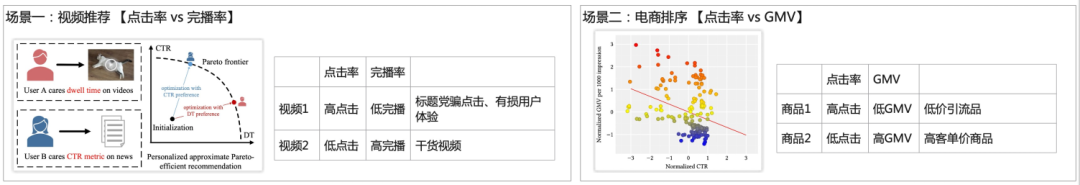 多目标(Multi Objective Learning)是MTL中的一种。在业务场景中,经常面临既要又要的多目标问题。而多个目标常常会有冲突。如何使多个目标同时得到提升,是多任务多目标在真实业务场景中存在的意义。如下图,视频推荐任务,既要点击率又要完播率;电商排序,既要点击率又要转化率。如今,CTR预估领域采用多任务多目标是非常主流的建模方式。值得我们深入研究。