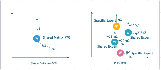 MMoE做了一个聪明的事情,“化整为零”。把一个共享参数矩阵化成多个结合gate的共享Expert,这样不同的loss在存在相互冲突的时候,在不同的expert上,不同loss可以有相对强弱的表达,那么出现相互抵消的情况就可能减少,呈现出部分experts受某task影响较大,部分experts受其他task主导,这种“各有所得”的状态。但是MMoE并不保证“各有所得”,PLE增加了spcific experts,保障“各有所得”,能够在“共享参数”的撕扯争夺上,有了最基础的保障。