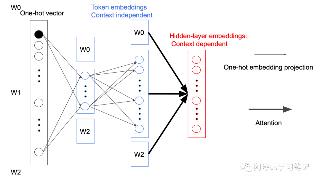 之所以可以这样做是因为每次反向传播时都只会更新一个 Token 相关参数,其他参数都不会变。而且在第一次投影的过程中,词与词之间是不会进行交互的,只有在后面的 Attention 过程中才会做交互,我们称为 Sparsely updated。如果词不做交互的话,完全没有必要用一个很高维度的向量去表示,所以就引入一个小的隐藏层。(这个过程是不是很像矩阵分解)