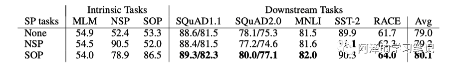 于是,作者对此进行改进,提出 Sentence order prediction(SOP),做法很简单,就是将原来预测的句子调换下顺序,sentence1 预测 sentence2 为正例,而 sentence2 预测 sentence1 为负例,这样就不用担心模型通过句子的主题而进行预测了。