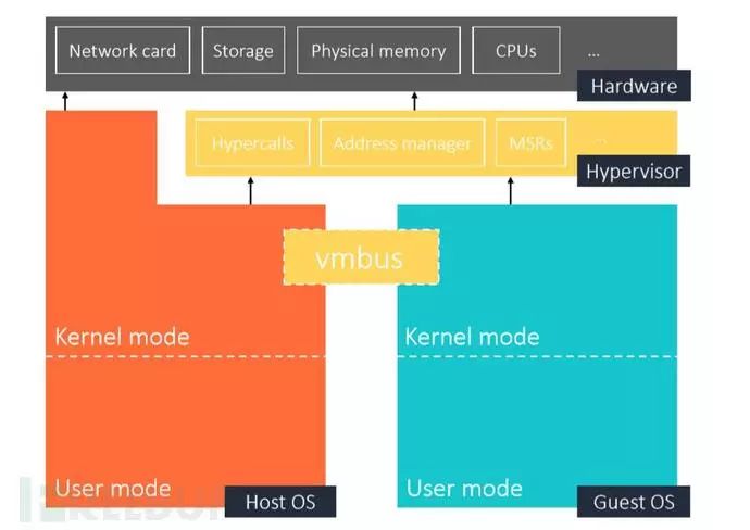 宿主机与虚拟机之间的数据传输通过VMBus(虚拟数据总线)实现,VMBus是微软开发的虚拟数据传输总线,用来宿主机和虚拟机之间交换数据和信息。使用VMBus的优点就是能进行快速、高效、大数据量的数据传输,极大的提升了虚拟机的性能。VMBus的原理和QEMU中的VirtIO设备类似,通过共享环形内存,每当要传输的数据写满整个环形内存时,就把数据发送到宿主机中。可以说,微软成功的借鉴了VirtIO设备的优点,取其优点用之,才会使得Hyper-V虚拟机性能大幅提升。