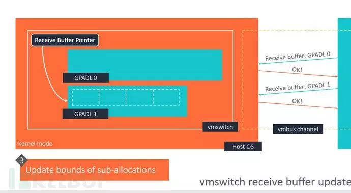 首先虚拟机发送GPADl通知内存地址指针,宿主机收到通知后更新内存指针,指到新的内存地址,但依旧保留这旧的子区分配表:
