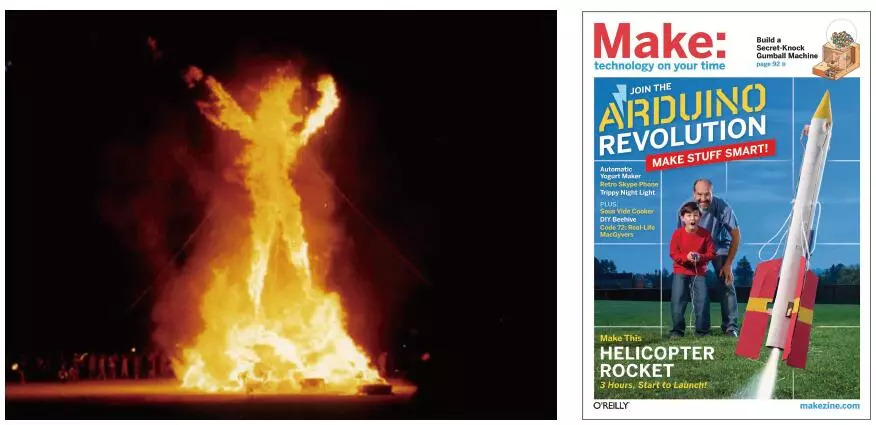创客运动的代表案例是“火人节”(Burning Man)活动。很多硅谷人士都会前往参加,甚至造成硅谷“万人空巷”的场景。之所以命名为“火人节”是因为,在活动最后一天,人们会将木头制作的雕像放在沙滩中央,将其与活动期间制作的艺术品全部烧光。