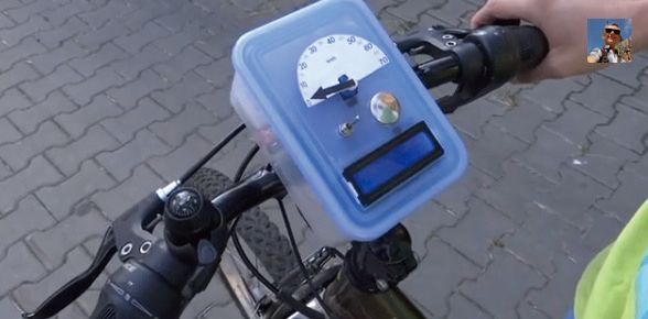 这款自行车计速器由便当盒、可以调节角度的伺服机、能显示文字的LCD、遇到磁铁就能连接电线的簧片开关(reed switch)制作而成,在轮胎外缘挂上磁铁后,轮胎每旋转1 圈,磁铁和簧片开关就会触碰1 次,簧片开关的电线感应到连接后,以此测量自行车的速度。伺服机制作的仪表盘和LCD 上显示自行车当前速度。