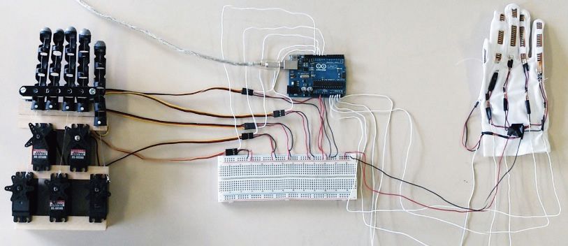 这款机器手能够根据人的手部动作活动,由伺服机和鱼线制作而成,戴在人手上的手套由可以感应手部弯曲的弯曲传感器(Flex sensor)制成。人弯曲手指后,机器手可以通过弯曲传感器感应弯曲程度,从而随之弯曲。