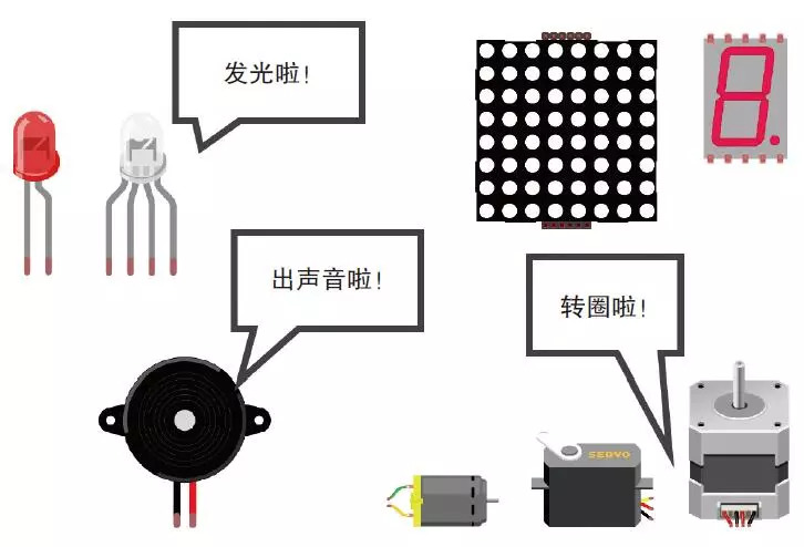 执行器也和传感器一样有许多种类,比如能够发光或者发声、转圈等。利用执行器可以使Arduino做出想要的某种动作。