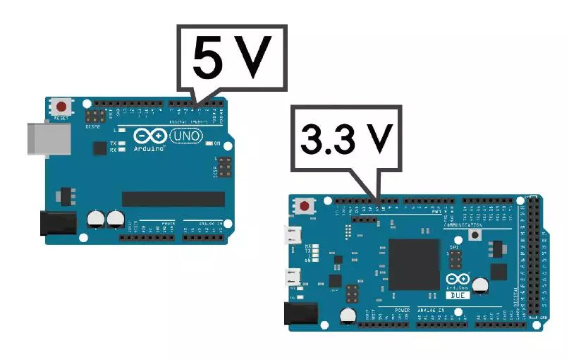 Arduino UND等常规Arduino模型使用的是Atmel公司出品的Atmega处理器。处理器就像是人的大脑。Atmega在5 V电压下运行,所以常规Arduino模型也在5 V电压下运行。反之也有不是Atmega的处理器,比如Arduino DUE和Arduino ZERO,这些模型使用的处理器是ARM。各位可能不知道,智能手机使用的处理器几乎都是ARM。ARM在3.3 V电压下运行,所以Arduino DUE和Arduino ZERO也在3.3 V下运行。如果电子板连接电压大于3.3 V会烧坏主板,请各位注意。