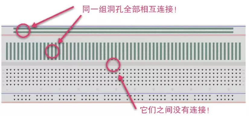 面包板能连接电子元器件的原理很简单:板内在横竖方向均嵌有金属条。拆开面包板底部可以看到内部结构,同组金属条上的洞孔相互连接,一般中间的孔每5个为一组,外圈的孔以长的两行连接。这两行中,红线连接电源,蓝线连接地线,这样能连接更多。要注意的是,长面包板里的长线中间部分有可能断开,最好提前确认。