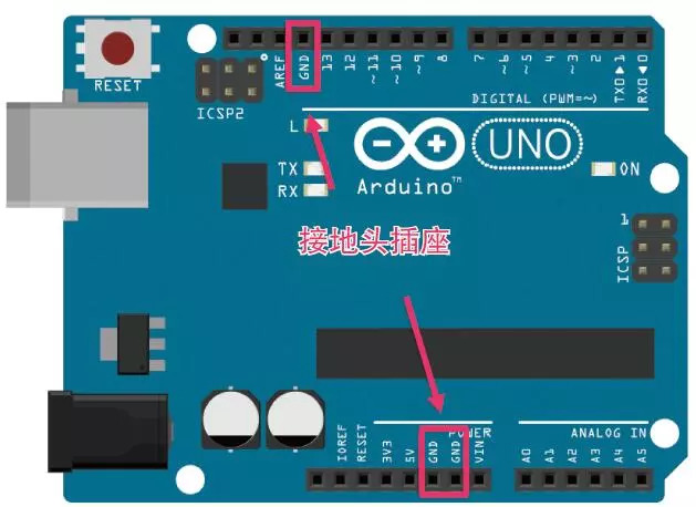 电压头插座右侧有两个写着GND的头插座,标有DIGITAL的最左侧也有GND头插座。GND以Ground(接地)表示电压为0 V,就像是干电池的负极一样,是电流的排出口。如果连接电子元器件,那么电子元器件的正极和3V3或5 V的头插座连接,负极和接地端连接即可。选择3V3或5 V均可,但常规Arduino模型常用5 V。