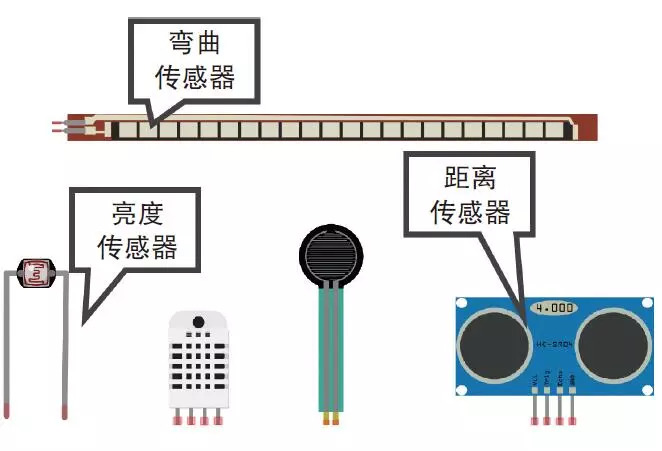 人有多种感觉器官,传感器也一样。有些传感器能够感应周围亮度,有些能够感应温度,还有的能够感应弯曲度。利用这些传感器,Arduino可以得知关于周围环境的信息。