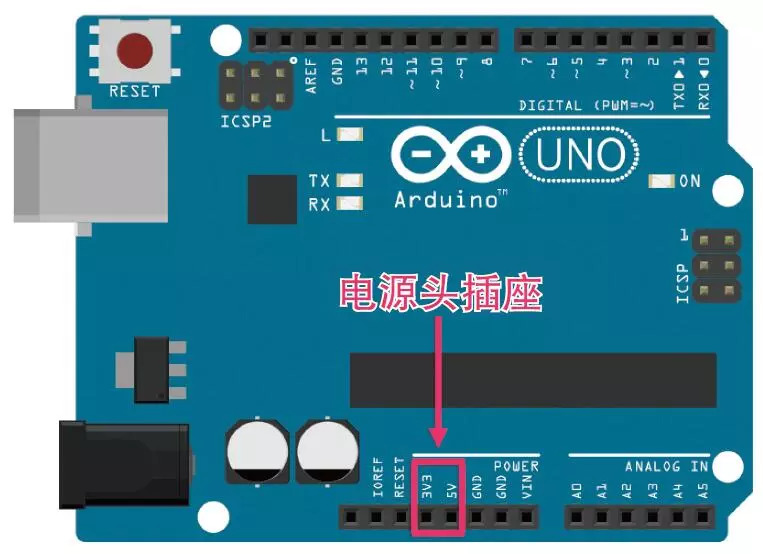 仔细观察Arduino板可以发现,POWER(电源)字样下方有3V3(或3.3 V),也能看到写着5 V的Header Socket(头插座)。头插座上写着3V3、5 V表示电压分别为3.3 V、5 V。像3.3 V这样带着小数点的电压的情况,通常略去小数点,而用V代替。这样标识电压的地方就像干电池正极部分一样,将其想象为电流流出的地方即可。