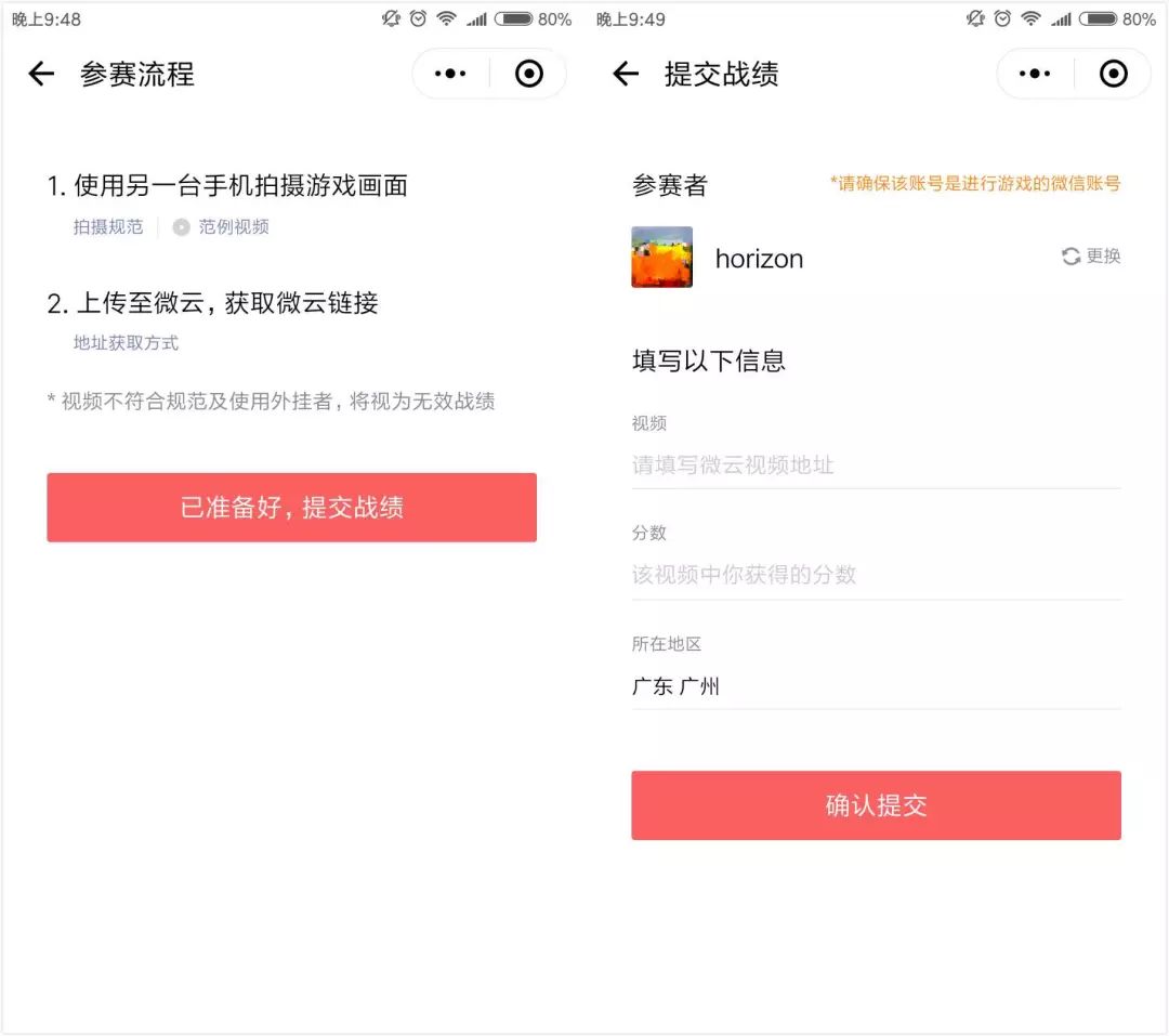 确保参赛者账号是视频中进行游戏的微信账号,再填写好微云视频地址、分数和所在地区,最后点击「确认提交」,就成功参赛咯。
