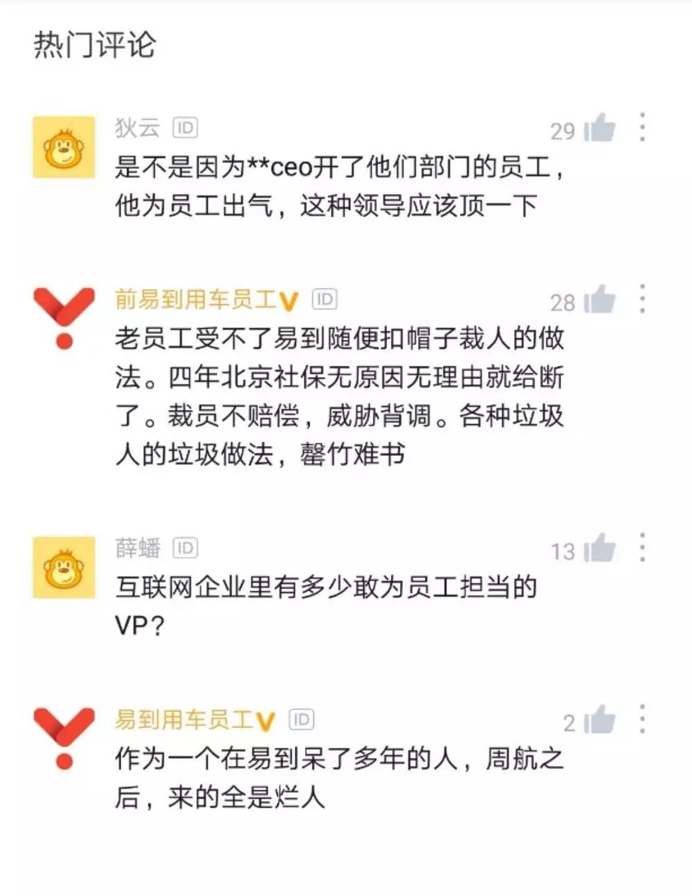 有认证为“前易到用车员工”的用户发表评论称:“老员工受不了易到随便扣帽子裁人的做法。四年北京社保无原因无理由就给断了。裁员不赔偿,威胁背调。”