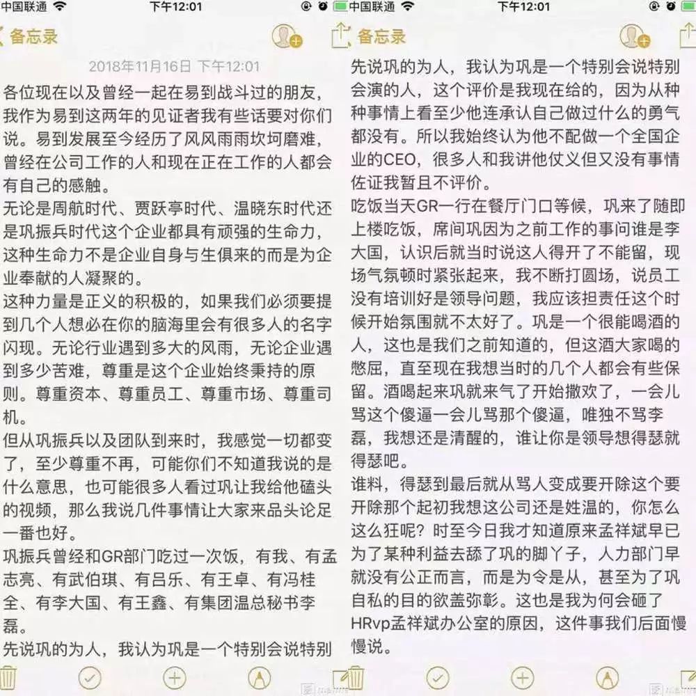 这名内部人士的版本是:吕艺为易到GR部门负责人,因为之前和巩振兵有些工作上的矛盾,所以几个月前,GR部门的员工请巩振兵吃饭喝酒,“相当于吃了这顿饭,大家一笑泯恩仇”。当晚巩振兵被灌醉,“吕艺说要磕头拜大哥,以后就是好兄弟了,因为巩振兵喝多了瘫在那里,神志也不是很清醒,所以就也没有阻止”。