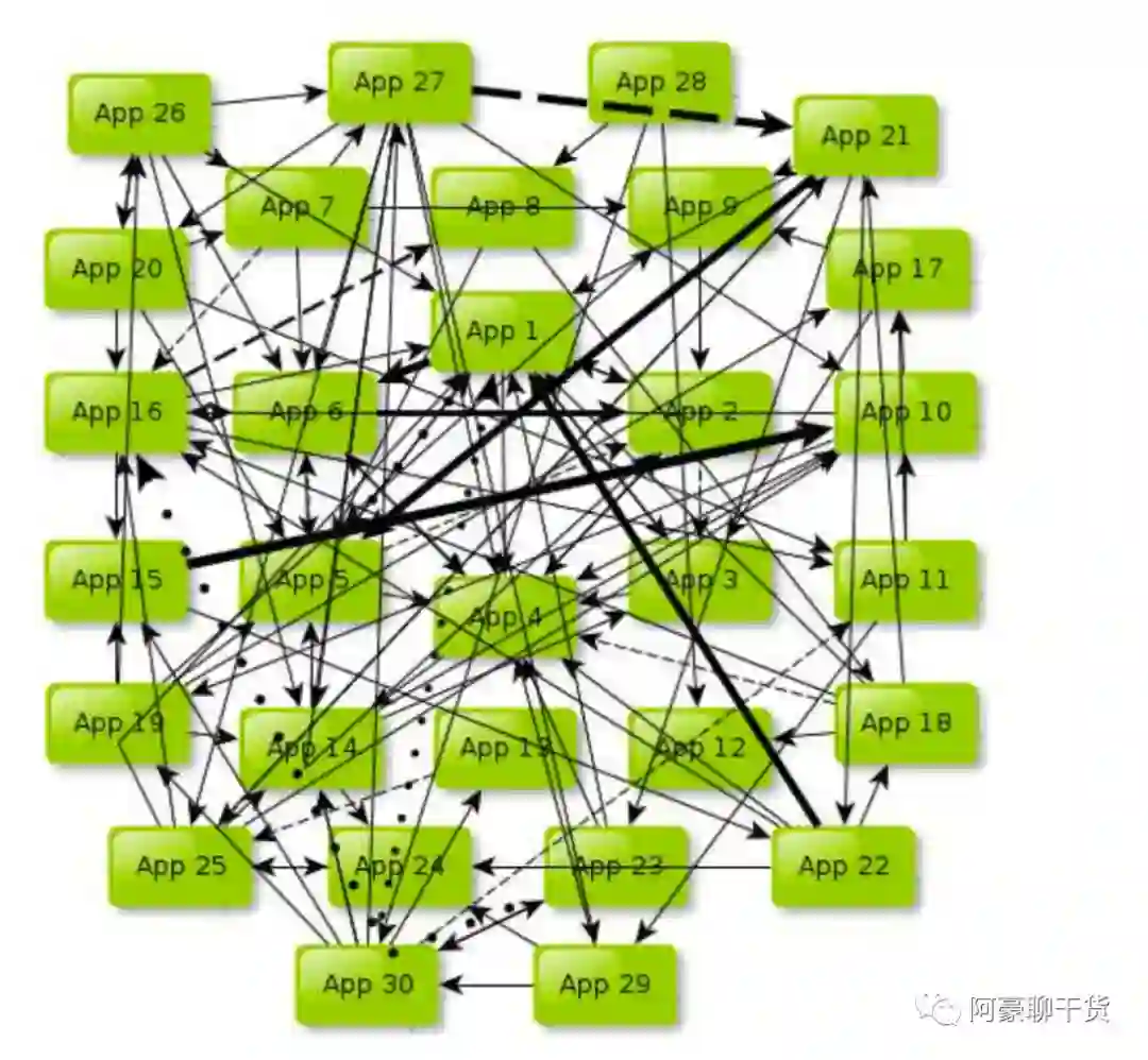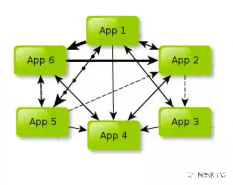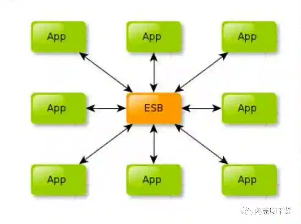 跟 SOA 相提并论的还有一个 ESB(企业服务总线),简单来说 ESB 就是一根管道,用来连接各个服务节点。ESB的存在是为了集成基于不同协议的不同服务,ESB 做了消息的转化、解释以及路由的工作,以此来让不同的服务互联互通; 随着我们业务的越来越复杂,会发现服务越来越多,SOA架构下,它们的调用关系会变成如下形式: