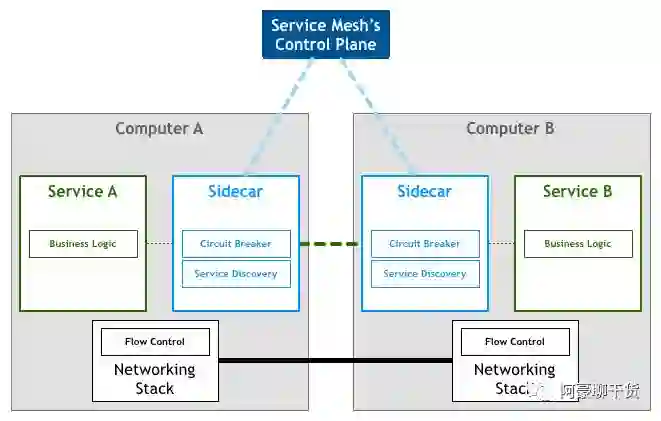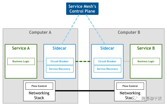 17 年年底,非侵入式的 Service Mesh 技术慢慢走向了成熟。Service Mesh ,中文释义“服务网格”,作为服务间通信的基础设施层在系统中存在。如果要用一句话来解释什么叫 Service Mesh,我们可以将它比作是应用程序或者说微服务间的 TCP/IP,负责服务间的网络调用、熔断、限流和监控。我们都知道在编写应用程序时程序猿一般都无须关心 TCP/IP 这一层(比如提供 HTTP 协议的 Restful 应用),同样如果使用服务网格我们也就不需要关系服务间的那些原来是由应用程序或者其他框架实现的事情(熔断、限流、监控等),现在只要交给 Service Mesh 就可以了。服务网格架构图如下: