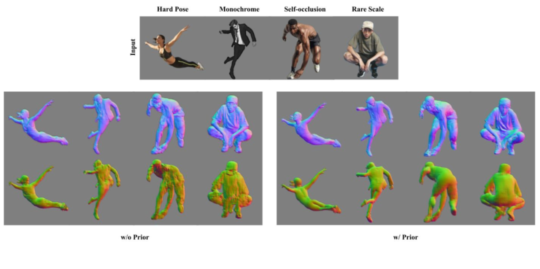 有了 SMPL body(左边,w/ Prior)的加持,clothed normal 预测更准确。