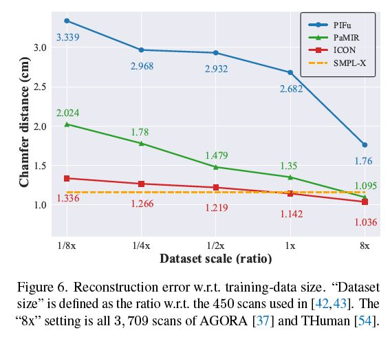 。毕竟 RenderPeople 一个就几百块人民币,实在离谱。仅仅给 1/8 的训练数据(50 个 3D human scan),ICON 重建的质量就可以超过用接近 4000 个训练数据训出来的 PIFu,也超过了用 450 个数据训出来的 PaMIR。作为一个舍弃了 global CNN 的极其 local 的模型,ICON 对训练数据量确实不敏感。而恰恰就是这种钝感,对于提高三维人重建的姿势水平至关重要。