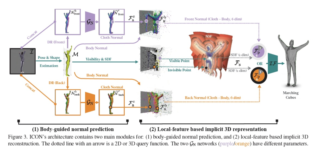 。先从图像中预测 SMPL body,渲染出正反 body normal,与原始图像合并起来,过一个法向预测网络,出正反 clothed normal。然后对于三维空间中的点,clothed normal 取三维,body normal 上取三维(注意,这里是从 SMPL mesh 上用最近邻取的,而不是从 body normal image 中取的),SDF 取一维,一共七维,直接扔进 implict MLP,Marching Cube 取一下 0.5 level-set 等值面。