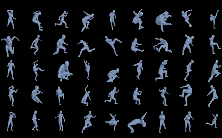 但是,数量足够多且姿势各异的三维人体却是 SCANimate 构建高质量可驱动数字人的必要前提!这个不难理解 —— 要让一个数字人无论怎么动弹,衣服裤子的褶皱都很真实,如果用数据驱动的思路去做,那么网络得先「看过足够多」类似动作下衣服的形变,才能准确摸索出衣服形变与动作姿势之间的关联。