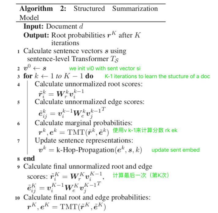 该算法中的 ek 表示边(子树)的信息,用在迭代中信息的保存,可以更好的计算根节点;rk 表示根(摘要句)。