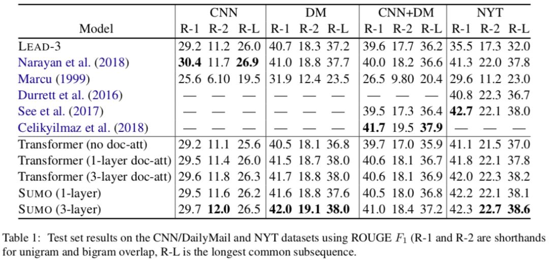 我们观察拥有三层结构化attention的SUMO表现最好,这证实了我们的假设,即文档结构有利于摘要的抽取。表1中的结果还显示SUMO和所有基于Transformer模型的文档注意(doc-att: document-level self-attention)的性能都优于LEAD-3。SUMO(3层)比最先进的方法更有竞争力。SUMO优于Marcu(1999),尽管后者使用了语言上的文档表示。