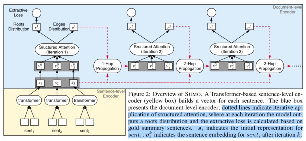 我们提出了SUMO,该模型将一个文档变为多根依赖树,其中根是有摘要价值的句子,而附加在根上的子树是阐述或解释摘要内容的句子。SUMO使用在以前的迭代中学习到的信息,通过迭代细化过程构建潜在结构,从而生成复杂的树。在两个数据集上进行的实验表明,SUMO与最先进的方法相比具有竞争力,并能归纳出有意义的树结构。