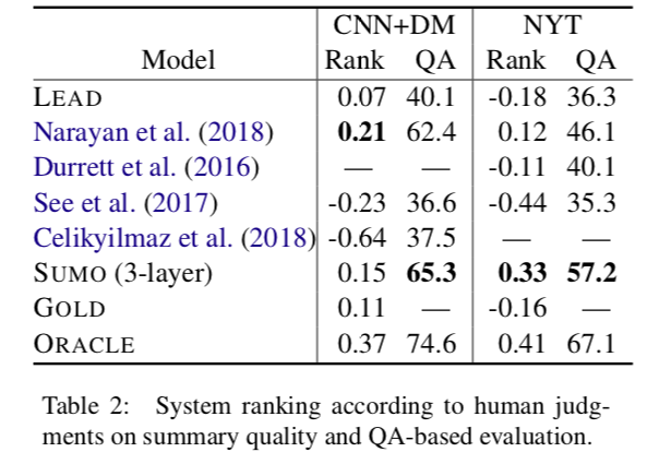 表2 (QA列)给出了基于QA的评估结果。根据SUMO的summary,参赛者在CNN/DailyMail上的正确率为65.3%,在NYT上的正确率为57.2%。