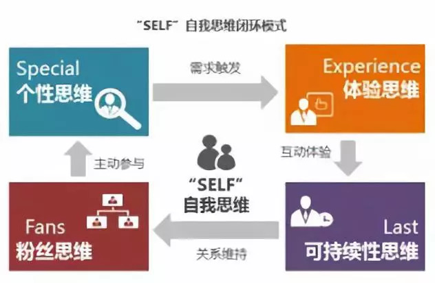 社会在急剧变化,新事物不断涌现,消费者心理稳定性逐渐降低。如今消费者越来越重视体验,渴望彰显个性。消费者的思维模式也开始转变,逐渐形成了从需求触发、需求满足、消费实现到可持续的价值认同的“自我(SELF)”消费思维闭环。“自我(SELF)”理念主要包括个性思维(Specific)、体验思维(Experience)、持续思维(Last)和粉丝思维(Fans)。