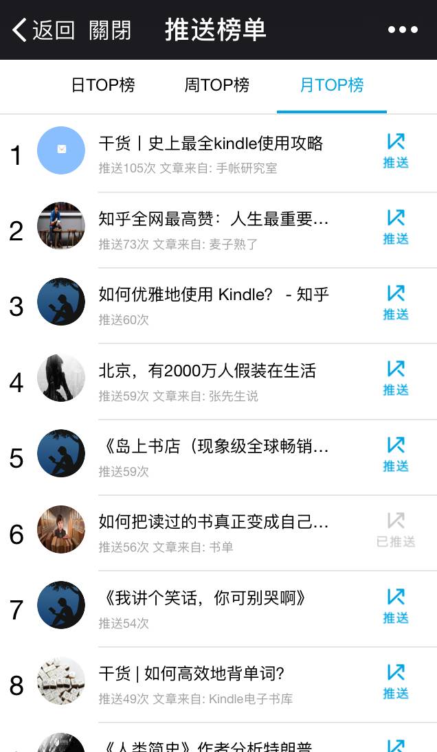 4. 公众号菜单【今夜有阅】--【Send to Kindle】,可以查看自己的推送记录,也可以查看亚马逊平台的用户推送榜单。