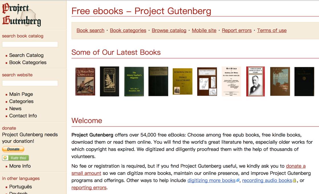 古腾堡工程,由志愿者参与,将文化作品的数字化和归档。始于 1971 年,是最早的数字图书馆。主要是西方文化传统中的文学作品,大多数版本使用的语言是英语,但也有许多非英语的作品。古腾堡工程根据美国版权法对其电子书进行版权验证,所以可以放心使用。