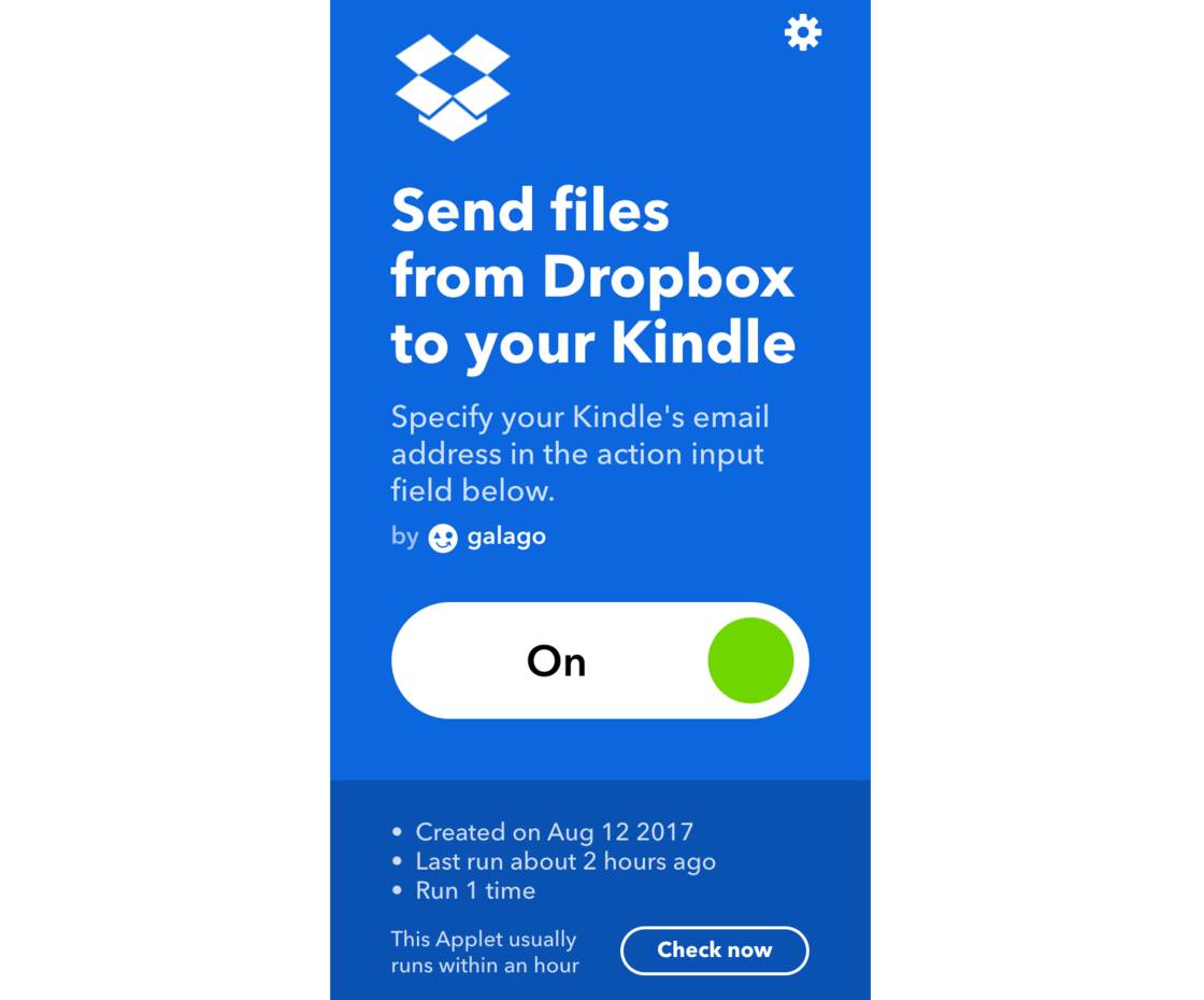 如果我们的文档文件比较多,每次推送都需要打开邮箱去通过附件推送。那这个发送邮件的过程能否做到自动化呢?答案是肯定的。利用 Dropbox 和 IFTTT,通过 Gmail 就可以做到自动将 Dropbox 指定文件夹下的文件发送到 Kindle 设备邮箱。