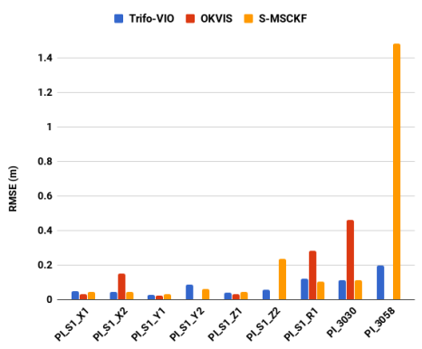 图2展示了比较结果。对于所有的方法均调整了参数使其尽可能表现最好。我们的Trifo-VIO 始终是表现最好方法的前两名。S-MSCKF的结果和我们的结果很接近,除了PI 3058,在这个数据集中,由于额外使用了线特征,我们的结果表现得更好。