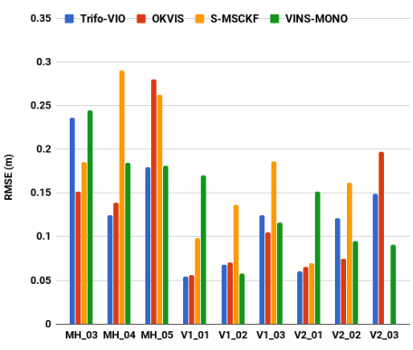 图1展示了评估结果,结果表明在MH04, MH05, V101和V201中Trifo-VIO是表现最好的方法。