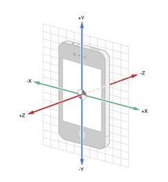 通过对原始加速度计、陀螺仪数据的计算,我们可以估算出手机姿态角(bodyangle)的变化。以iphone为例,其三个角的定义及方向如下图所示: