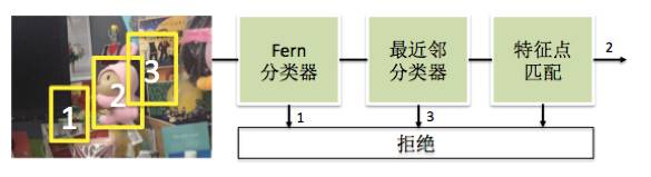 检测模块由级联分类器构成,共包括三层:随机蕨分类器(Random FernsClassifier)、最近邻分类器(Nearest Neighbor Classifier)以及特征点匹配。如下图所示。
