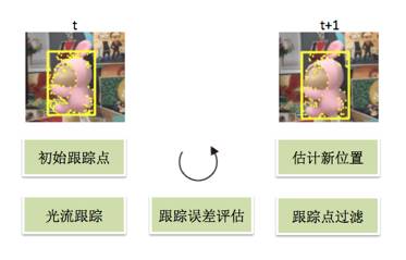 在跟踪中,我们依然沿用Lucas-Kanade光流跟踪算法[4]。即给定若干跟踪点,跟踪器会根据像素的运动情况确定这些跟踪点在下一帧的位置。如下图所示。