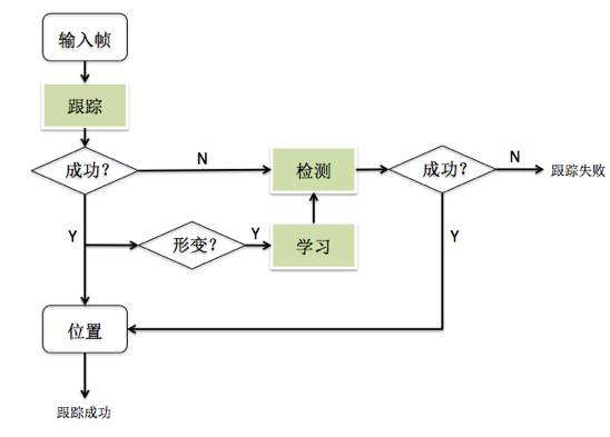 TLD算法对每一帧图像对处理过程,都包含跟踪、检测和学习三个部分。如下图所示。通过将跟踪和检测的结果进行融合,得到每帧的目标估计位置,另一方面在新的目标预测位置上进行模型更新,从而提升检测器的鲁棒性。