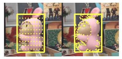 在原始TLD算法中,跟踪点采取均匀网格取点的方式,如下图a所示。此种取点方式的优点是速度快,而且不受跟踪目标区域影响,总能取到固定的点数,但缺点是获得的点往往并非图像的特征点,不具有鲜明特性无法有效反映图像本质特征,因此在跟踪中往往容易发生点漂移,使得跟踪器不够强健。基于此,我们对点的选取做了改进,改用fast点来快速提取目标区域特征点,作为跟踪器的初始点进行跟踪。