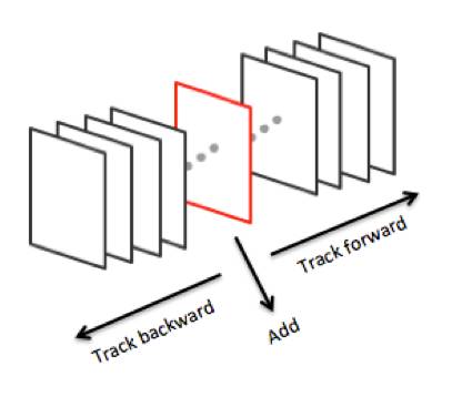 我们的视频tagging框架如下图所示。当拍摄完一段视频进行预览时,在某一帧时添加目标,接着从该帧开始依次进行后向和前向跟踪,计算该目标在视频序列中每一帧的位置。
