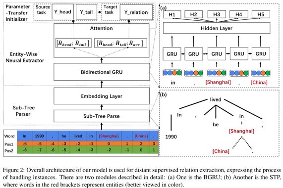 针对句内噪声的问题,本文采用子树解析的方法,去除与表达关系不相关的词汇;针对关系抽取器不健壮的问题,本文采用迁移学习的方法,用实体分类对模型的参数做预训练。